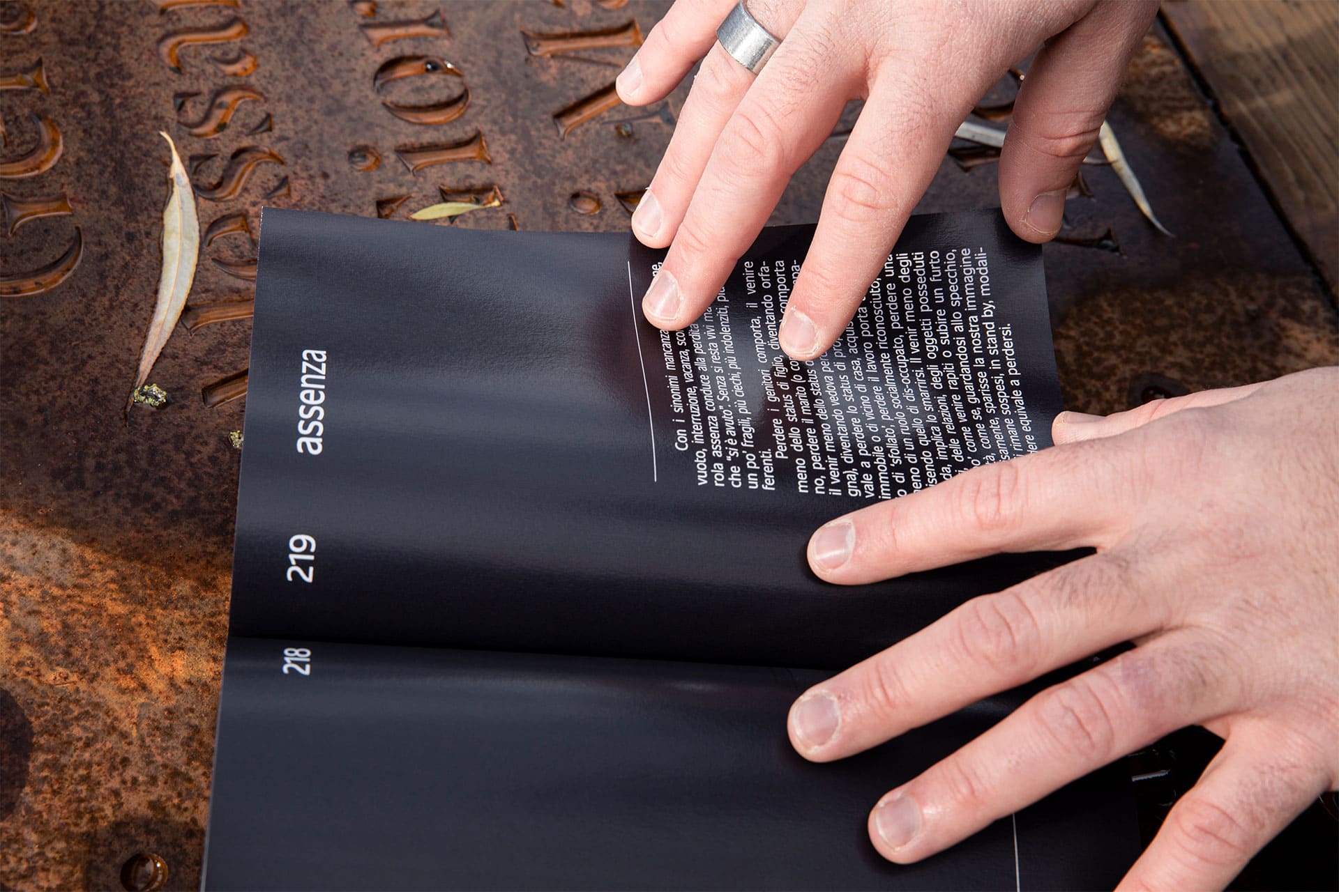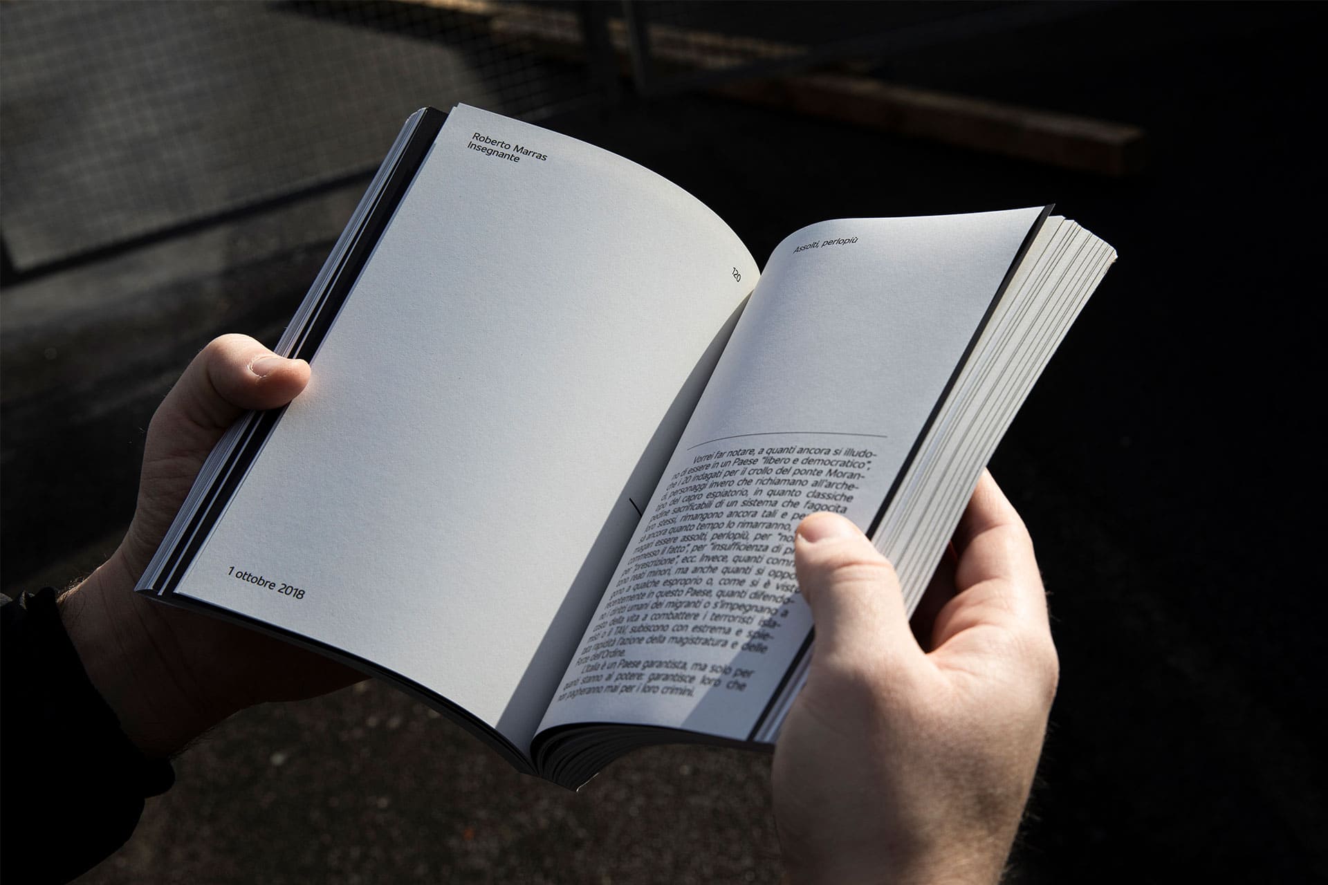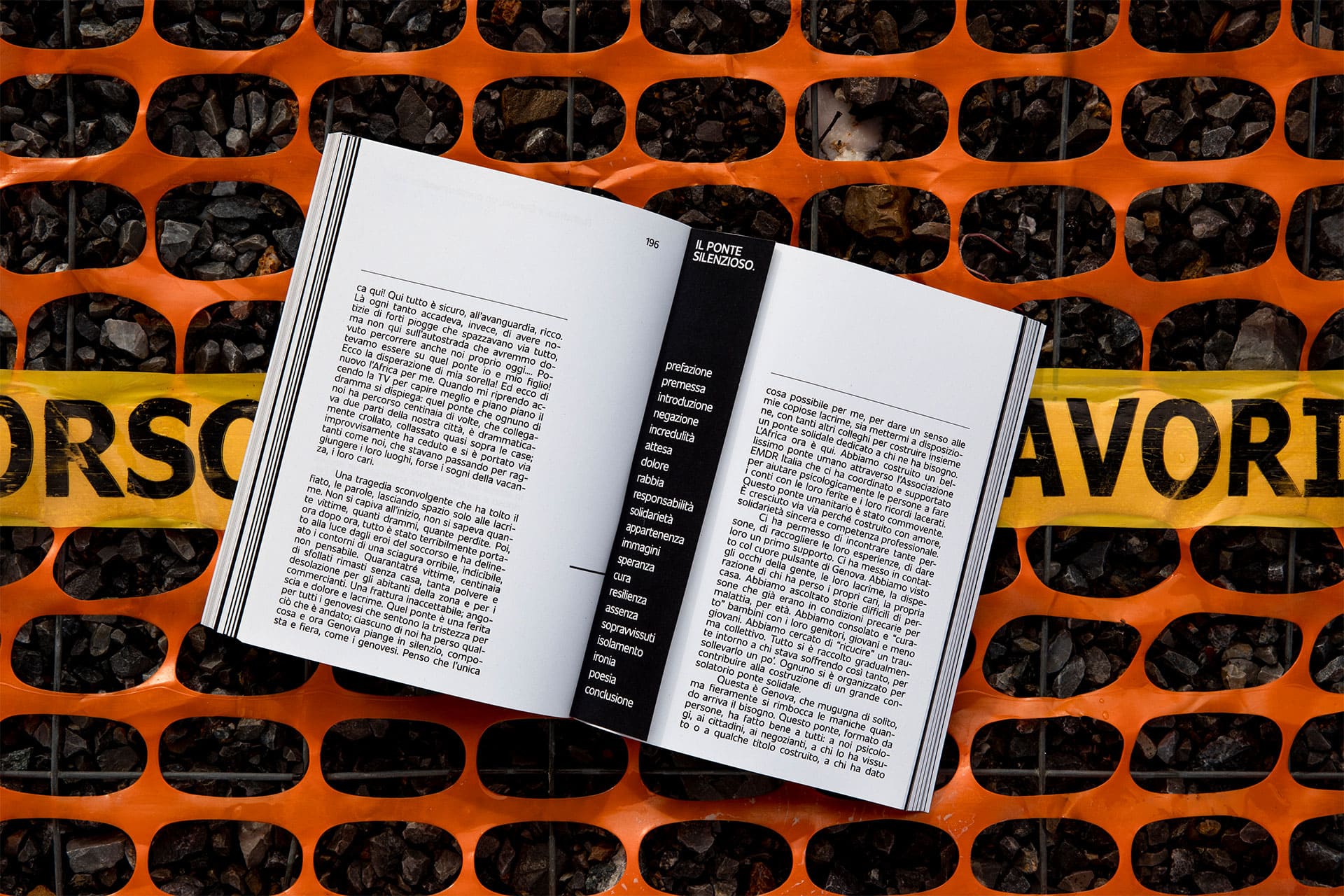 Concetto di spazio: lo spazio che ha lasciato il crollo del ponte, il vuoto che concettualmente è stato creato dentro di noi. Questo libro vuole essere uno spazio bianco in cui riflettere, uno spazio che rimarrà sempre, al di là di ogni tipo di ricostruzione. Il libro è corredato da un segnalibro: come una bussola, aiuta a orientarsi nella lettura per non perdere il segno dell’emozione che si sta ripercorrendo. Chi legge diventa parte attiva del libro.
